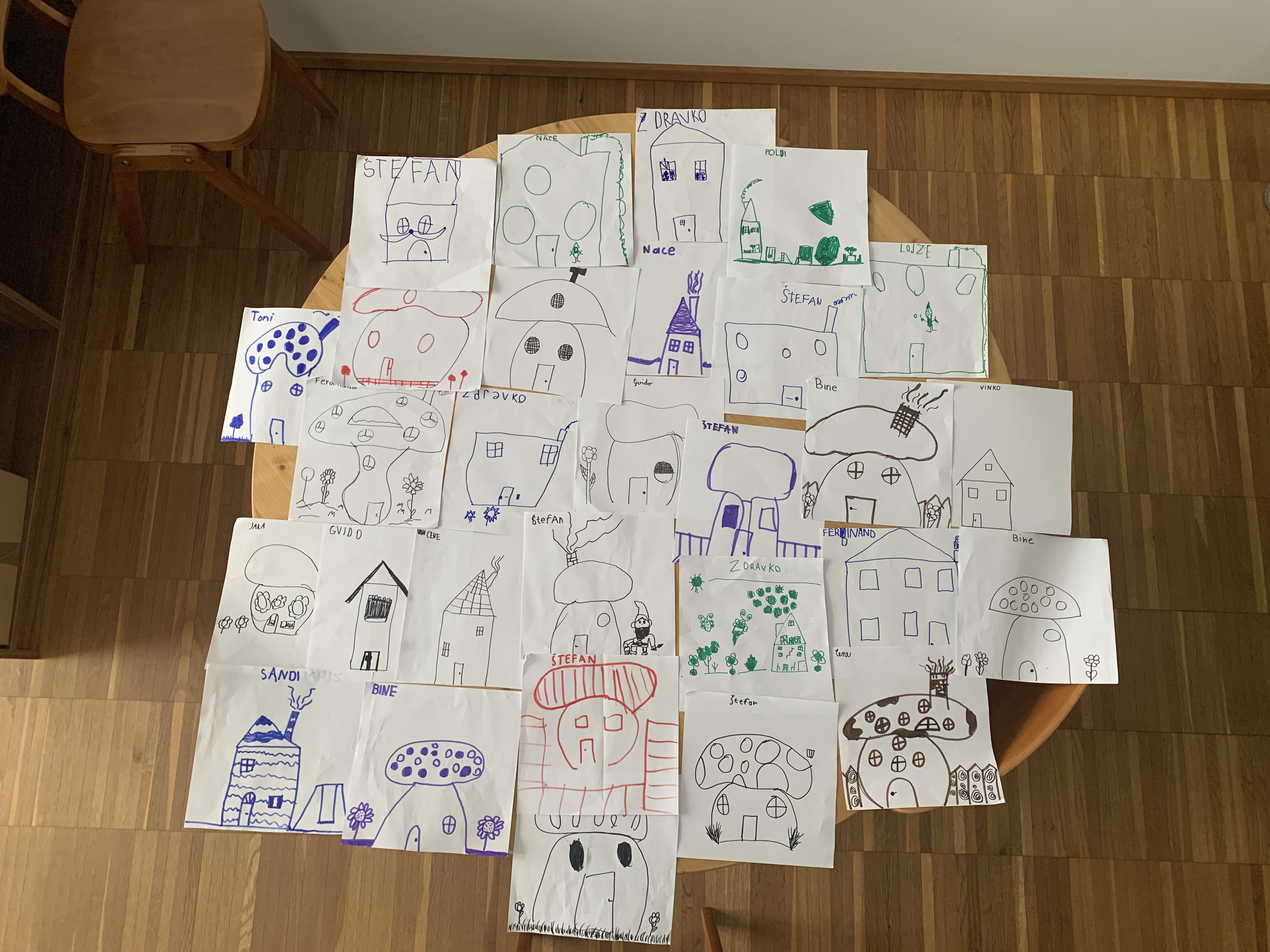 We then moved on to a more creative challenge. Students came up with their own rules for what houses of different professions should look like (for example, both gardeners and tailors have round windows, but only gardeners (obviously) have a garden). Each student then choose one gnome and drew its house. This is where their creativity truly came to life — we saw mushroom-shaped houses, flat and steep roofs, gardens, swings, fences, windows of all shapes and sizes, and discovered that (almost) everyone draws a chimney on the right side of the house.