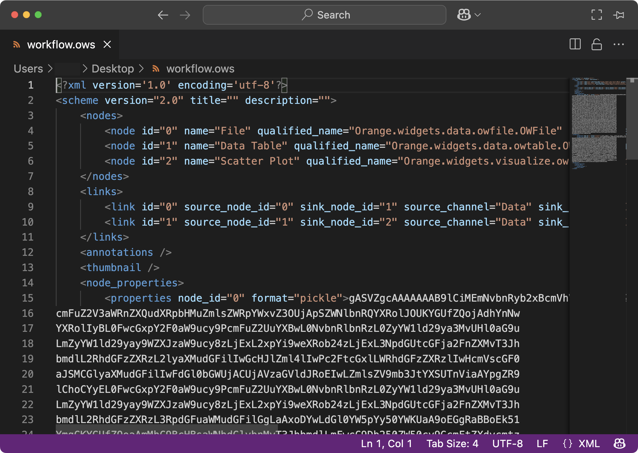 The fifth video shows how to save Orange workflows. They are saved in the .ows format, which is essentially XML under the hood. A simple Ctrl+S/Cmd+S will open the save dialogue, where you can select where to store the workflow. Remember, the workflows store widget settings and the workflow structure, but not the data.
