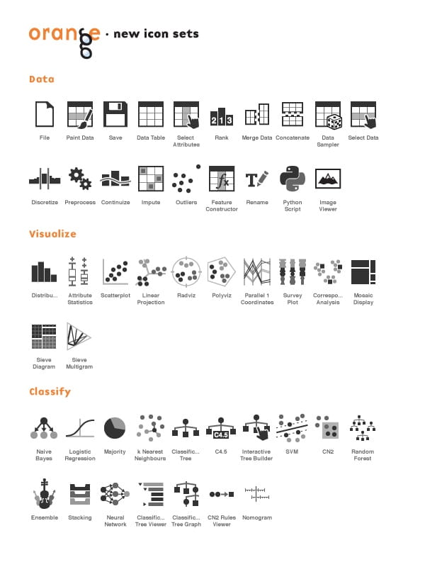Orange GUI is being redesigned. Expect a welcome screen with selection of preloaded widget schemes, simpler access to computational components, and integration with intelligent interface (widget suggestions). For the project we have engaged a designer Peter Čuhalev. To give you a taste of what is going on, here are some icons for widget sets that are being redesigned. There are in B/W, the color will be decided on and added in later stages. Below are just the icons - widget symbols with no frames. Current frames are rounded squares, while it looks like the widget frames for the new GUI will be circles. New icons are designed in a vector format.