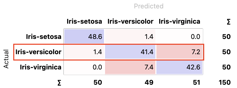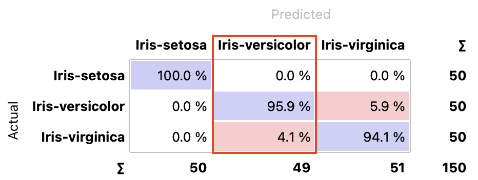 - Proportions of predicted shows how many instances classified as, say, Iris-versicolor are in which true class; in the table we can read the 0% of them are actually setosae, 95.9% of those classified as versicolor are versicolors, and 4.1% are virginicae.