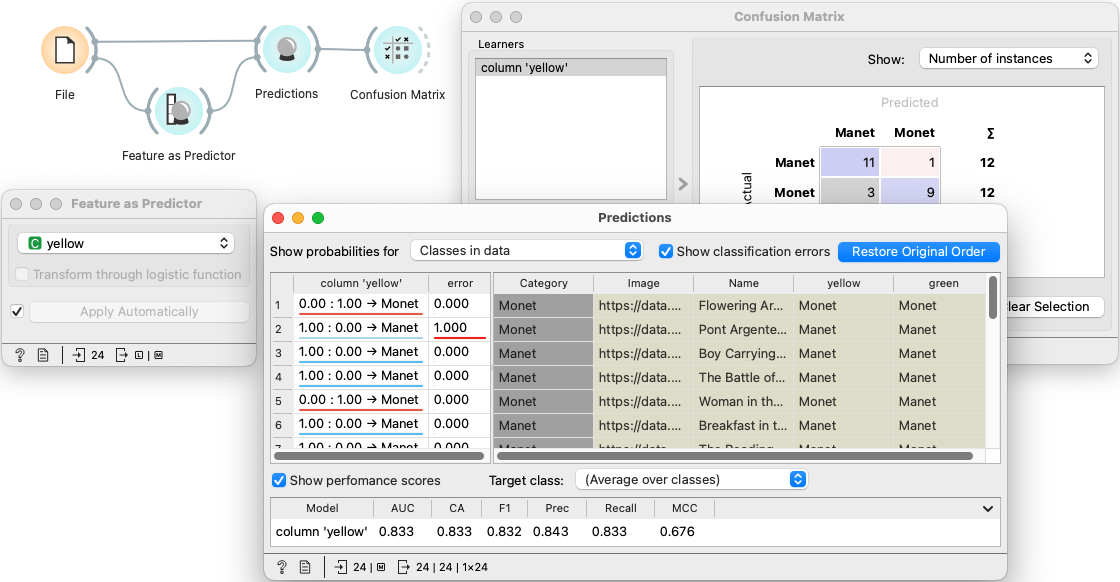 Two groups, called "yellow" and "green" compete at distinguishing between the works of Monet and Manet. We can choose the group in Feature as Predictor and observe the usual classification results.