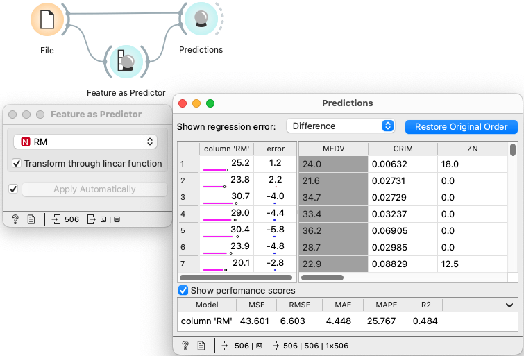 How well does the price of a house correlate with the number of rooms? Here we can (and must) enable transformation because the scale of the feature's values is very different from the scale of the target variable. Note that this measures the fit rather than predictive power because we do not test the model on unseen data.