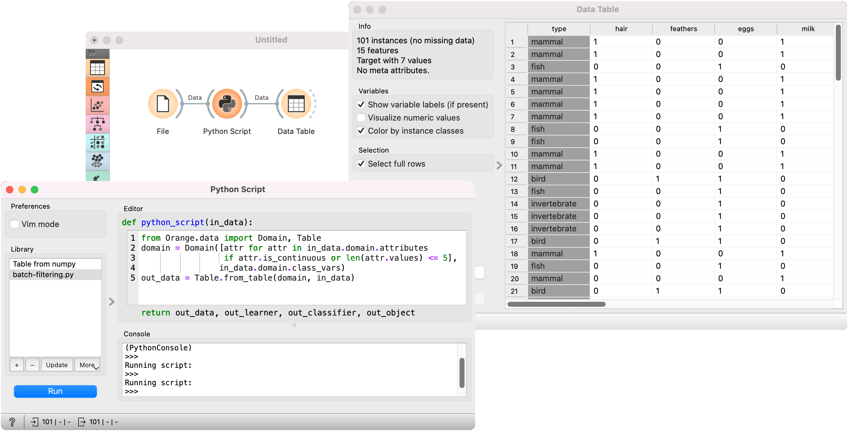 Python Script widget is intended to extend functionalities for advanced users. Classes from Orange library are described in the documentation. To find further information about the Orange.data classes see Table, Domain, and Variable documentation.