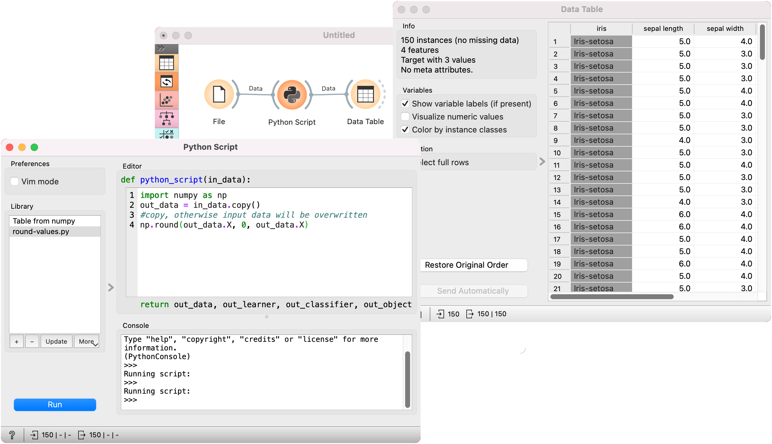 Python Script widget run a python scripts in the input, when a suitable functionality is not implemented in an existing widget. The script has in_data, in_distance, in_learner, in_classifier and in_object variables (from input signals) in its local namespace. If a signal is not connected or it did not yet receive any data, those variables contain None.