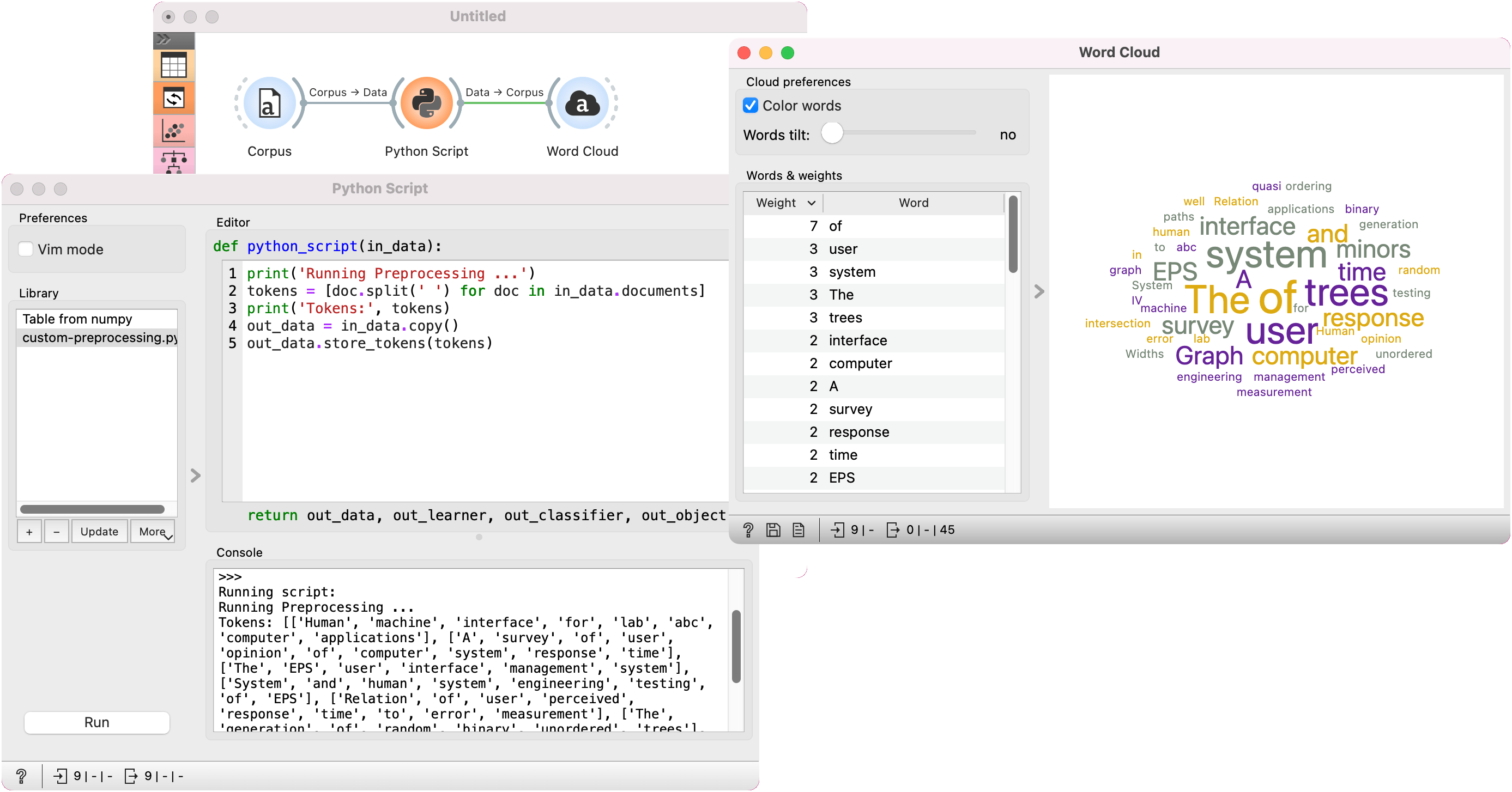 The final example uses Orange3-Text add-on. Python Script is very useful for custom preprocessing in text mining, extracting new features from strings, or utilizing advanced nltk or gensim functions. Below, we tokenized our input data from deerwester.tab by splitting them by whitespace.