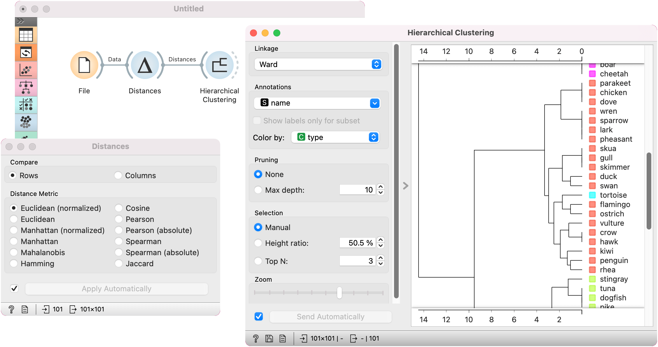 The first example shows a typical use of the Distances widget. We are using the zoo.tab data from the File widget. We compute distances between data instances (rows) and pass the result to the Hierarchical Clustering. This is a simple workflow to find groups of data instances.