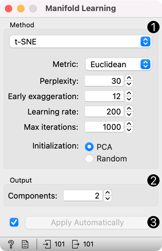 Manifold Learning is a technique which finds a non-linear manifold within the higher-dimensional space. The widget then outputs new coordinates which correspond to a two-dimensional space. Such data can be later visualized with Scatter Plot or other visualization widgets.